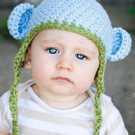 0-3m Organic Cotton Chunky Mini monkey Flap Hat Sky Blue with Pistachio Trim