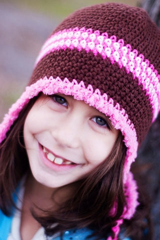 Child 5- Tween COTTON FURRY EARFLAP HAT- Brown with Pink Stripes- and furry trim