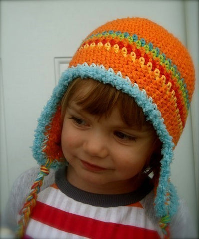 COTTON EARFLAP HAT- Tangerine with Rainbow stripes- and furry trim