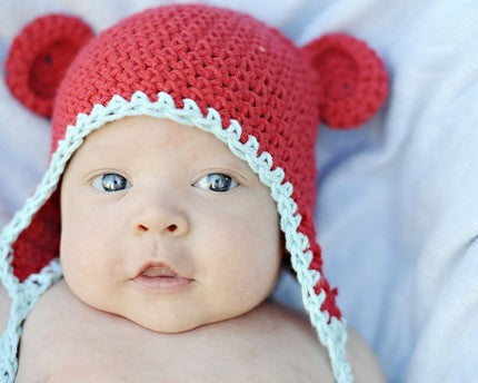 Cotton Mini Monkey Flap Hat- Cherry with Aqua Trim 6 - 24 months