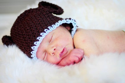 Cotton Mini Monkey Flap Hat - Chocolate Brown with Baby Blue Trim 0-6 months